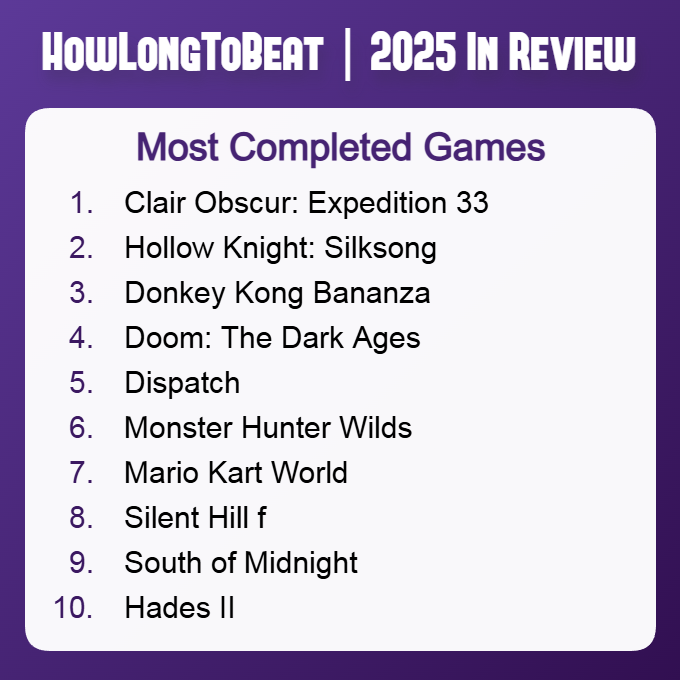 当然,这份榜单在很大程度上取决于玩家是否愿意拥有HowLongToBeat账号,并主动记录游戏时间和进度。但如此多玩家愿意投入精力,也充分说明了《光与影:33号远征队》的吸引力。值得一提的是,《丝之歌》如此高难度却位居第二,《超英派遣中心》在11月中旬更新最终章后仍名列第五,也显示了其广泛的受欢迎程度。