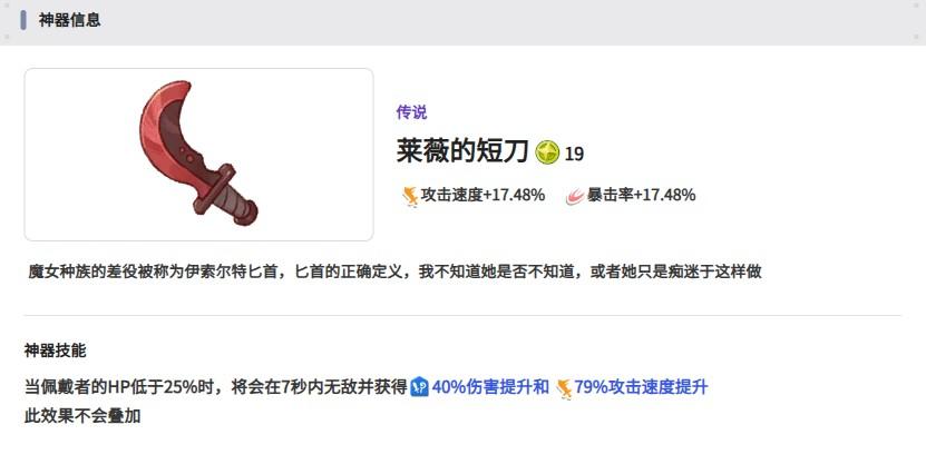 莱薇的短刀是攻速流的核心装备,除了基础暴击加成外,其真正的价值在于:当角色血量低于25%时,将自动获得数秒无敌状态。在此期间,伤害提升40%,攻速最高可飙升79%,堪称绝地反击的神器。
