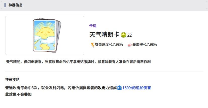 天气晴朗卡不仅能提升攻速和暴击,还附带特殊效果:连续攻击三次后,将触发闪电发射,对敌人造成额外伤害。这套组合效果尤其适合追求爆发输出的玩家。