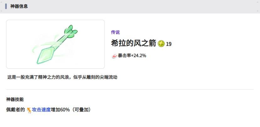 希拉的风之箭是风属性角色的专属武器,提供高达60%的攻速加成。当这些加成效果叠加时,将成为暴击流玩法的完美选择。如果你是风属性角色的爱好者,这款武器绝对值得优先考虑。