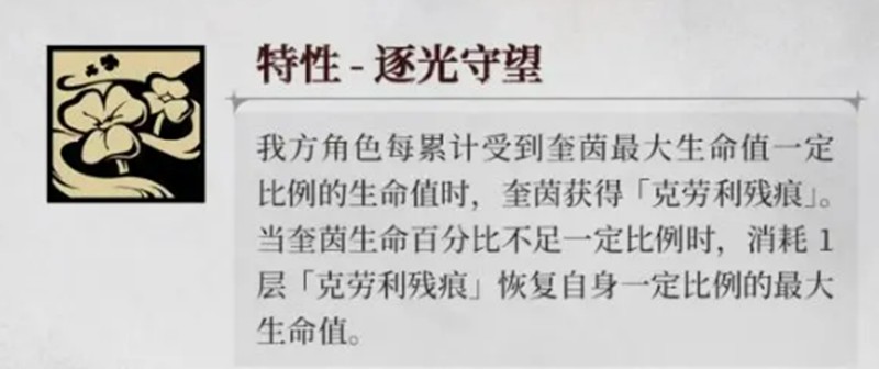奎茵的特性"逐光守望"是她战斗风格的核心之一。在战斗中,每当队友的生命值下降到一定比例时,她会获得一层"克劳利残痕"。这些残痕可以在特定条件下被消耗,用于恢复自身的生命值。这种机制不仅增强了奎茵自身的生存能力,也让她在队伍中承担起一定的辅助角色。她能够在关键时刻维持自身状态,从而更好地为队友提供支援。