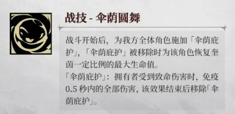 奎茵的战技"伞荫圆舞"进一步强化了她在团队中的辅助定位。该技能可以为队友提供"伞荫庇护"效果,在遭遇致命伤害时,能够短暂免疫一次伤害。一旦该效果被触发,奎茵还能为自己恢复一定比例的生命值。这种机制在面对高爆发敌人时尤为关键,能够让队友在濒死边缘获得一线生机,同时也能让奎茵在战斗中保持较高的续航能力。