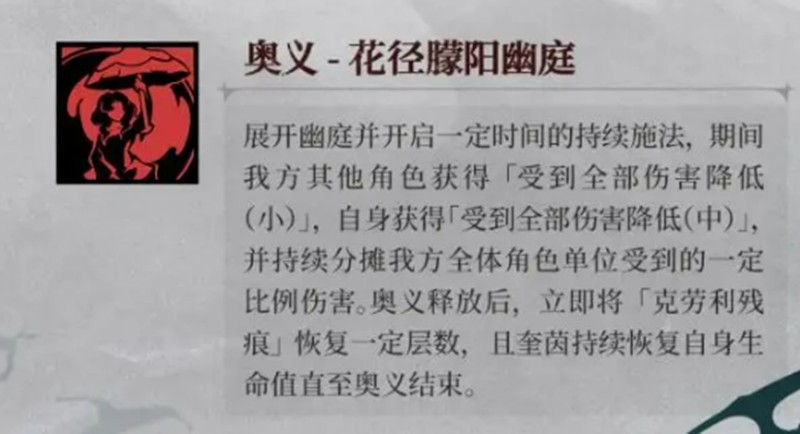 奎茵的奥义"花径朦阳幽庭"是她最具战略价值的技能之一。释放后,她会在战场上生成一个持续存在的幽庭区域。在该区域内,奎茵自身获得更强的伤害减免效果,同时队友所受到的伤害也会被显著降低。此外,她还会在奥义持续期间持续恢复生命值,并分摊队友所受到的伤害。这种机制让她在面对群体攻击或高难度Boss时,能够有效提升整个队伍的存活率。
