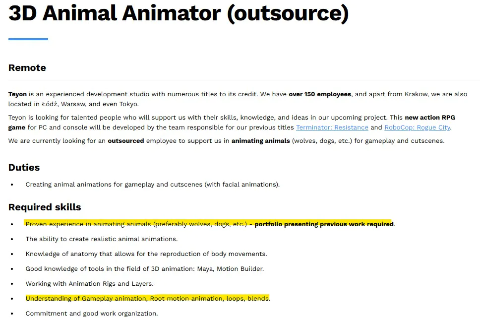 当前Teyon正在招聘3D动物动画师(外包),工作内容包括为游戏玩法和过场动画制作狼和狗的动画,表明这些动物可能会在游戏中扮演更重要的角色,可能是敌人,或者是同伴。