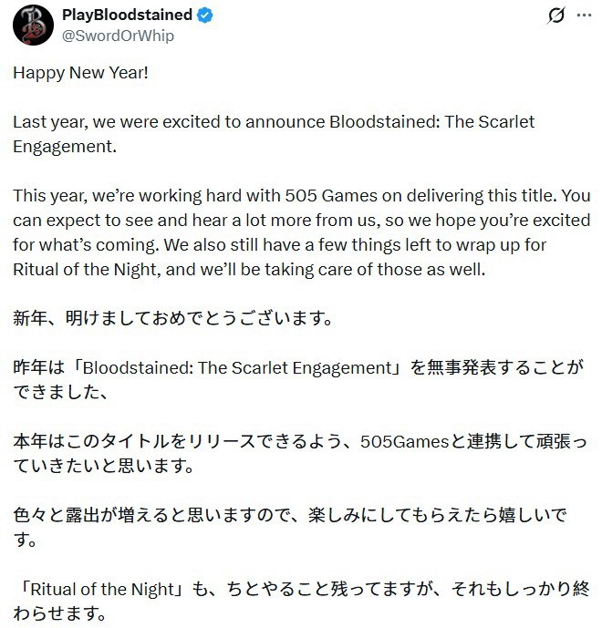 官方表示:"去年我们公布了新作《赤痕:绯红契约》,今年我们将与505Games紧密合作,确保本作在2026年顺利发售。不久后会有更多情报公布,敬请期待。目前《夜之仪式》仍有部分工作待完成,我们也会认真收尾。"