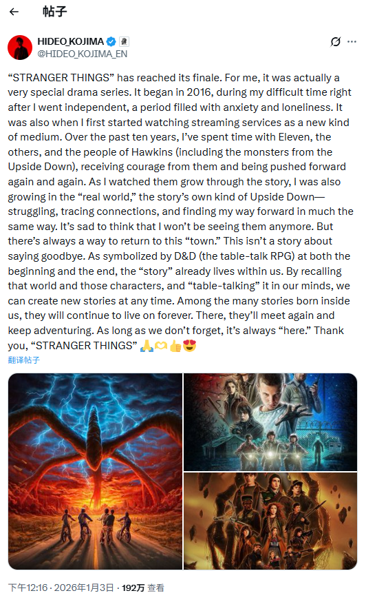 据小岛秀夫介绍,他是在2016年离开原公司、转为独立开发者后开始观看《怪奇物语》的。当时正值其职业生涯转折期,个人处境充满不确定性,而该剧也成为他首次系统接触流媒体平台内容的重要作品之一。在此后的十年间,他持续关注该剧的发展。