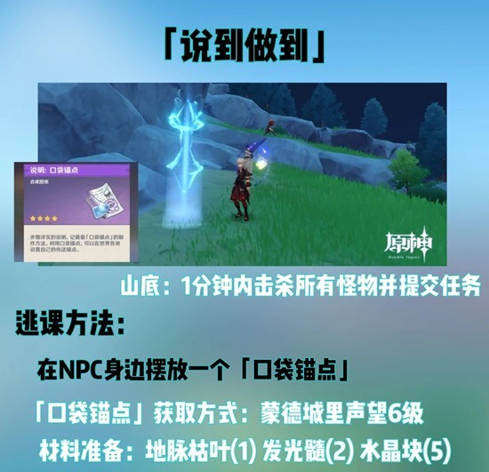 - 如果有口袋锚点,安插一个口袋锚点在NPC旁边,打完怪就直接传送回来。(蒙德声望等级6可以获得制作纸,到合成台合成即可)