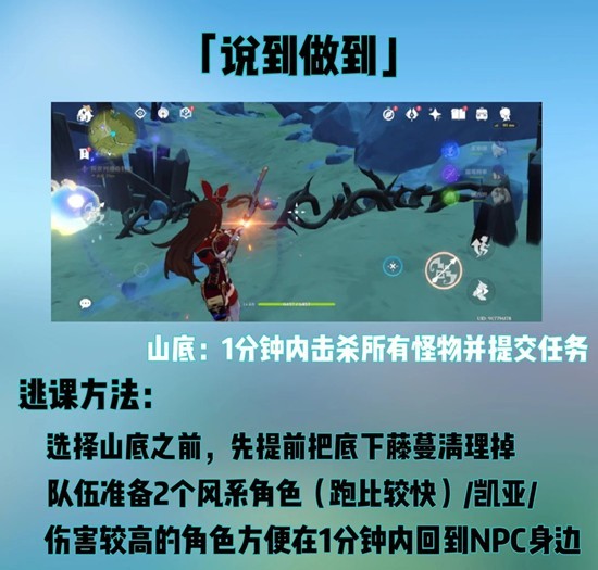 在「说到做到!」系列任务中,需要完美完成查耶维奇位于蒙德城外的三个地点的所有委托。每个地点的挑战条件各不相同,但共同点在于对细节的极致把控。