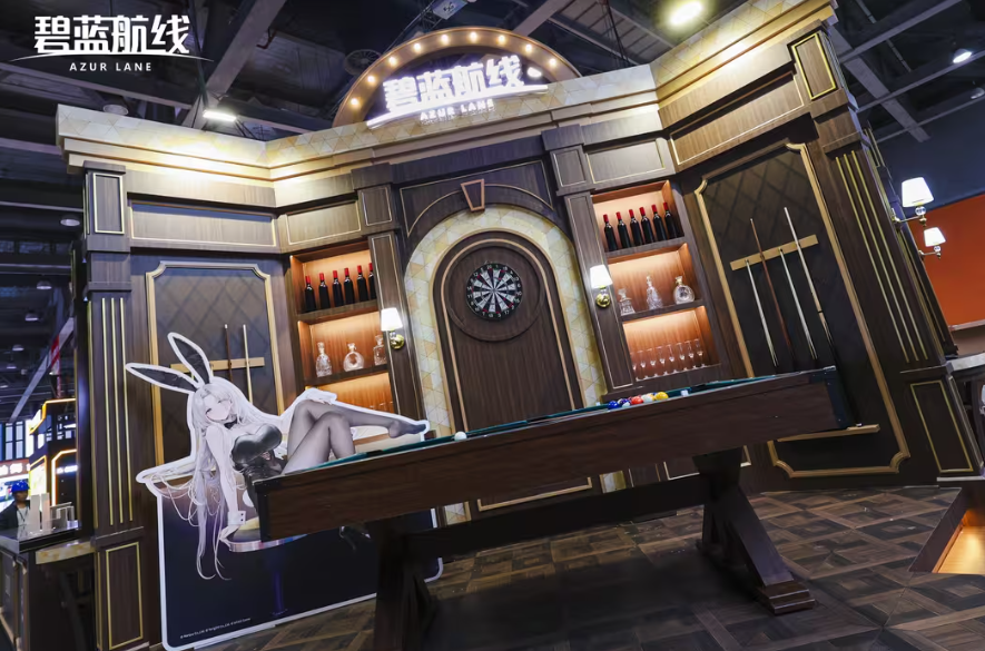 作为本次冬日快闪的第三站,《碧蓝航线》广州站快闪于2026年1月1日至3日在第37届萤火虫动漫游戏嘉年华上闪亮登场。不同于前两站的商场快闪形式,依托大型漫展平台,广州站快闪展区置景更加精致有趣——展台中央是一个复古风格的舞台,金色的边框与环绕的暖色灯泡,营造出华丽而温馨的氛围,舞台红色幕布背景上醒目的"AZUR LANE"霓虹字样,充满视觉冲击力。左侧的温馨吧台在迎接着每一位指挥官的到来,而右侧的休憩区域里,coser正为到来的指挥官上演欢乐互动。