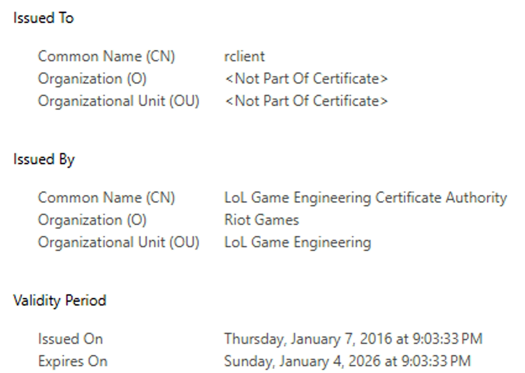 截至目前,拳头游戏尚未正式公布此次故障的具体原因。不过,社区中有多方反馈认为,问题可能与《英雄联盟》客户端中的安全证书过期有关。内容创作者Vandiril指出,登录失败是由于客户端证书在故障当天到期所致。尽管拳头游戏尚未对这一说法作出官方确认,但时间点与实际情况相符。