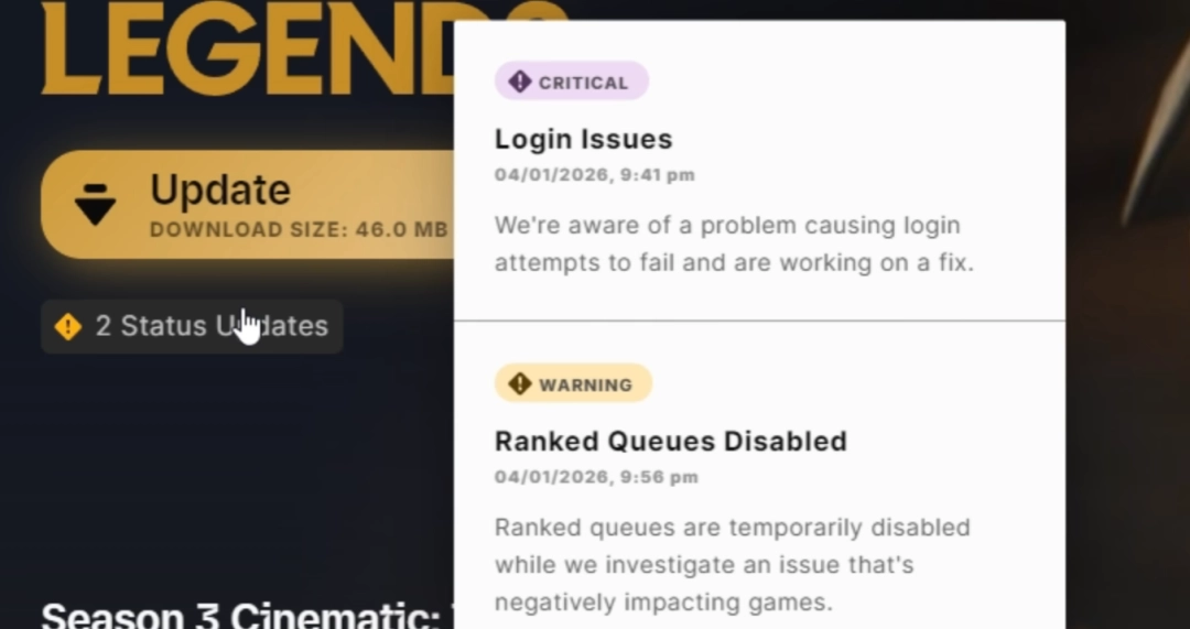 拳头游戏通过官方社交媒体渠道公开确认了此次情况。在故障期间发布的声明中,官方表示:“我们已注意到一个正在影响游戏、并阻止部分玩家登录的问题。在修复完成前,排位队列将暂时关闭,感谢大家的耐心等待。”该声明表明,此次问题并非个别现象,而是需要立即处理的系统性故障。
