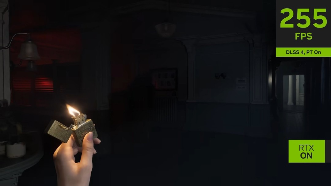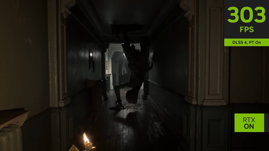 在NVIDIA最新发布的技术展示视频中,游戏呈现了基于路径追踪渲染的逼真光影效果。画面细节显示,路径追踪技术为游戏中的室内外场景带来了更真实的漫反射光照、柔和阴影及精确反射效果,显著提升了环境的沉浸感与恐怖氛围。