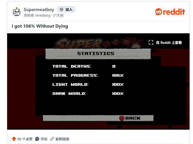 shredberg玩家就是这样一位执着于挑战《超级肉食男孩》不死通关的高玩,为了达成这项目标,付出了惊人的时间和精力,据悉花费的时间多达700~800小时,体验过10万次左右的猝死记录。