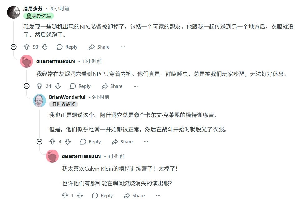 根据几位玩家反映,灰烬洞穴经常出现这种情况。"灰烬洞穴总感觉像某种CK模特训练营,通常他们衣着整齐,但战斗一开始他们就'脱'光了。"