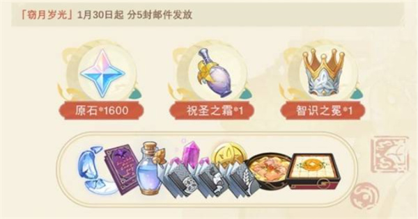 自 2026年1月30日起,官方将通过游戏内邮件向玩家发放奖励。内容包含600原石,并附带多种实用养成素材。