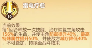 雷神,一技能,满阶的情况下,提升最高特殊属性50%,走击晕+暴击的流派,如果主加击晕,可以增加50%的击晕概率,极大提升击晕对方的可能性,让对方一直无法出手,被动挨打。二技能会降低对方的最高特殊属性,让对方的特殊属性触发的概率大大降低。且哪怕对方解除击晕,打了自己,雷神马上又能奶回来