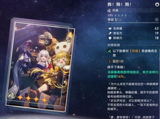 光锥选择:五星光锥自然是最优解,若暂时缺乏,四星的舞!舞!舞!能有效强化团队机动性。过渡期也可选用其他增加速度或火伤加成的替代品。