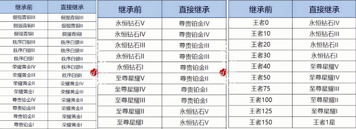3、王者50星以上:荣耀王者、传奇王者,除了排位关注度最高段位的王者150星外,此次新增王者125星继承规则。