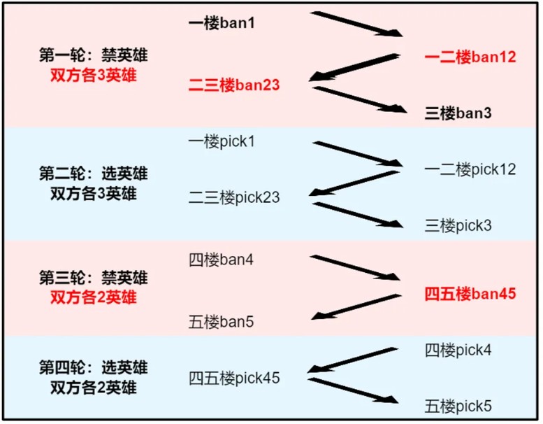巅峰万强赛会使用专属禁/选人规则:红蓝双方轮流禁/选英雄,流程如上图所示。