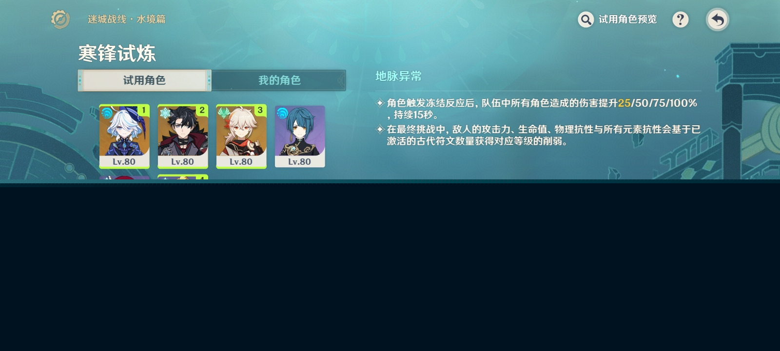 本次试炼可直接通过活动界面进入秘境,无需寻找特定传送点。系统提供的试用角色包含莱欧斯利、芙宁娜、万叶及米卡,构成以冻结反应为核心的双冰作战体系。