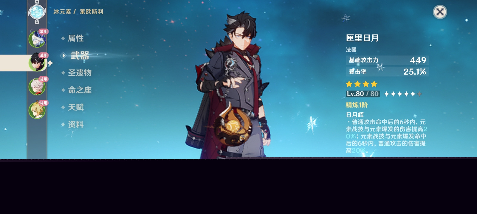 当前版本中,4.6版本全角色配装指南对武器选择有详细解析,莱欧斯利适配「图莱杜拉的回忆」或「四风原典」,圣遗物优先考虑「冰封迷途的勇士」4件套。