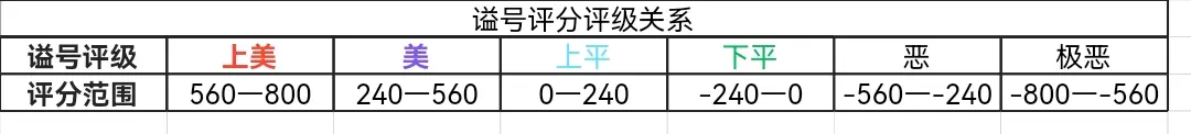 谥号评级分为6档,分别为上美、美、上平、下平、恶、极恶,对应分数为: