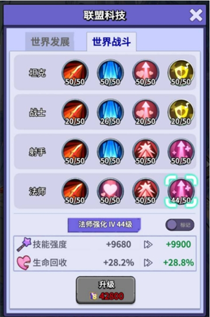 完成以上步骤就可以开始点【世界战斗】了,建议先将四职业的前三个强化都点到10级将所有科技解锁,之后根据自己阵容去点即可,什么时候把种子汽油拉满,什么时候点资源地没有最优解,上面的步骤也不需要严格遵守。