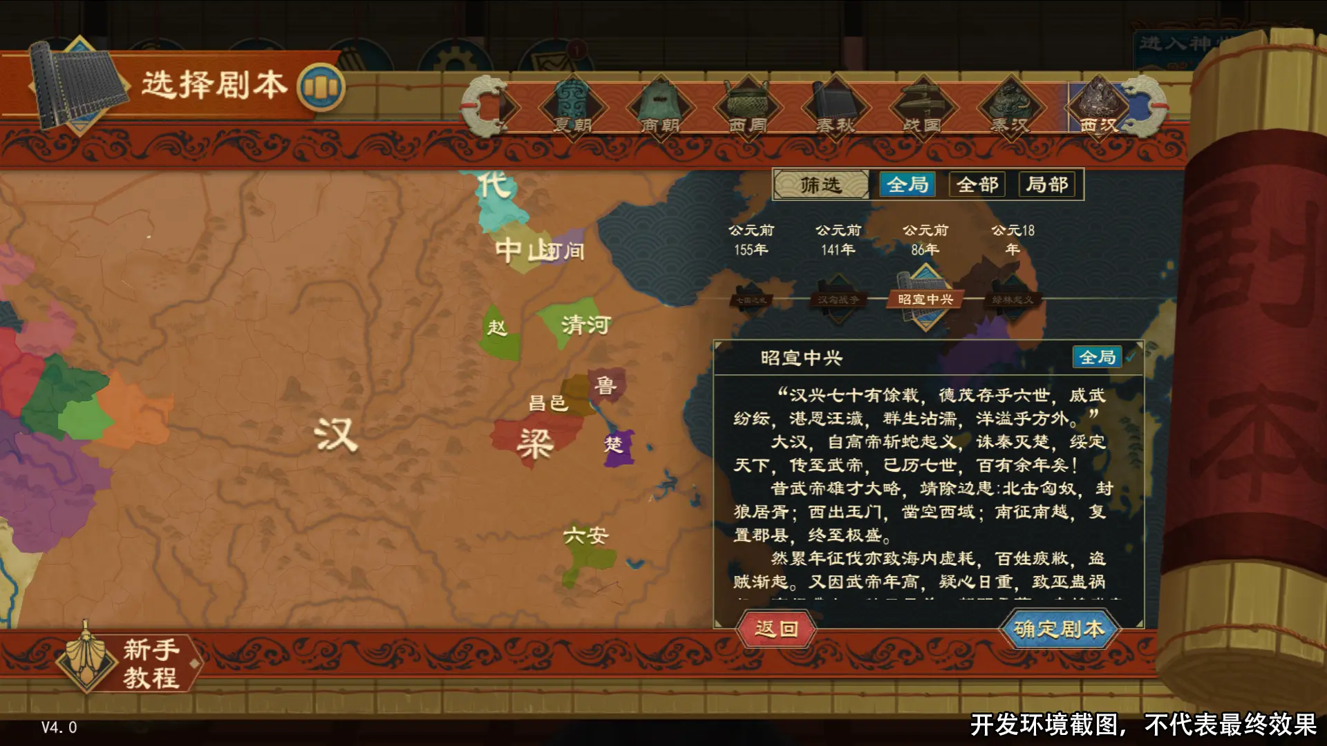 新增西汉剧本包,包含四个剧本,分别为七国之乱、汉匈战争、昭宣中兴、绿林起义