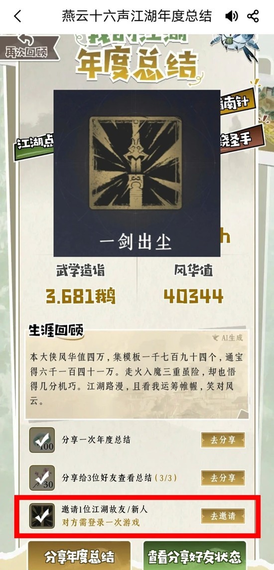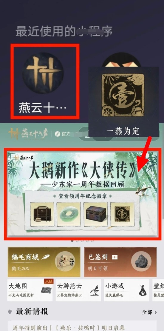 第二枚"一燕为定"徽章需通过微信活动获取。完成年度数据回顾后,将你的江湖足迹分享至社交平台即可领取。该徽章采用燕子衔枝造型,寓意玩家与游戏的约定。