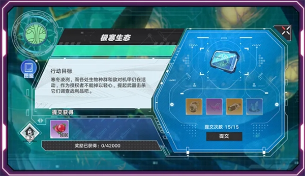 1、极寒生态:前往指定区域击杀生物或敌对机甲,收集生态样本并提交,每日可提交15次,累计提交样本获取活动代币,最高可兑换42000代币对应的奖励。