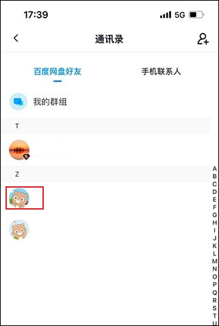 启动百度网盘APP,进入主界面后点击底部导航栏的"共享"选项,跳转至消息页面后,找到并点击"通讯录"图标;