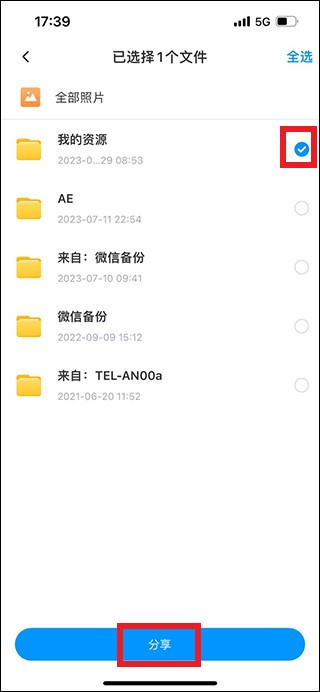浏览并勾选需要分享的文件,最后点击底部的"分享"按钮完成操作。