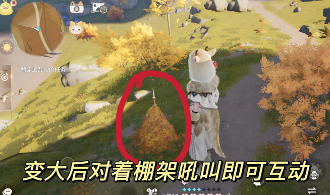 从安眠之林传送点出发后,装备变大套装对着棚架使用吼叫技能即可完成互动