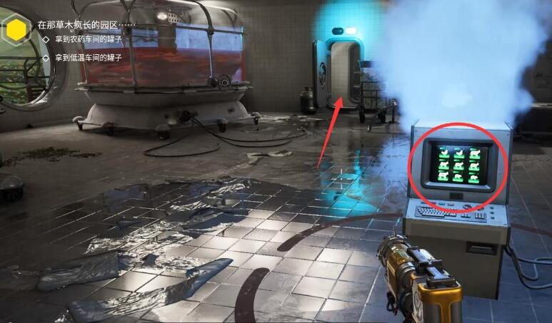 3、正对操作板,与左手边三个动物水箱上的阀门互动。