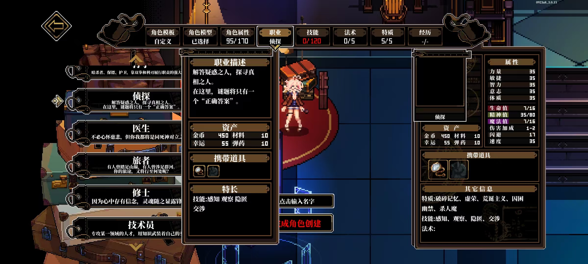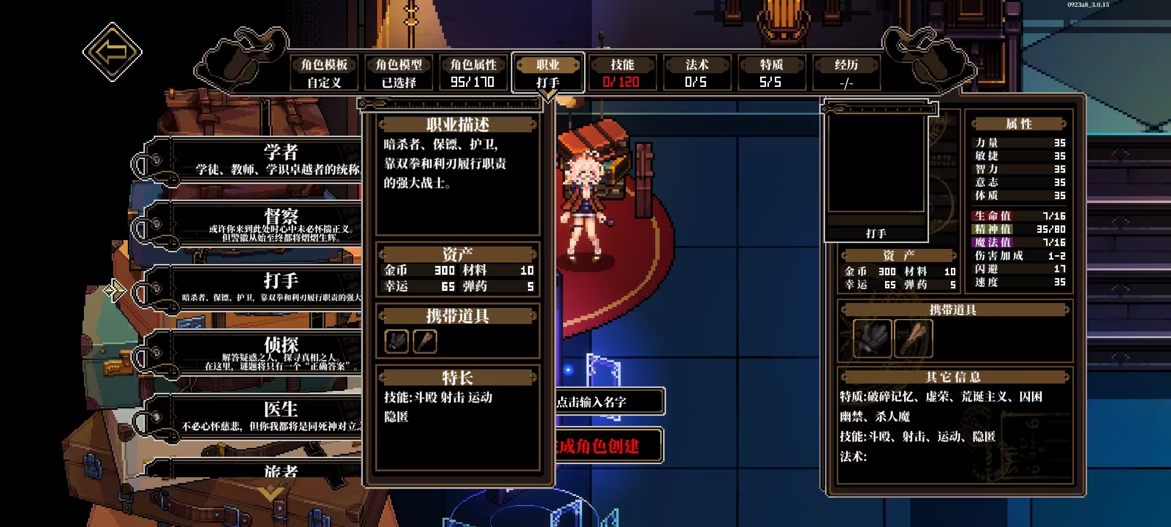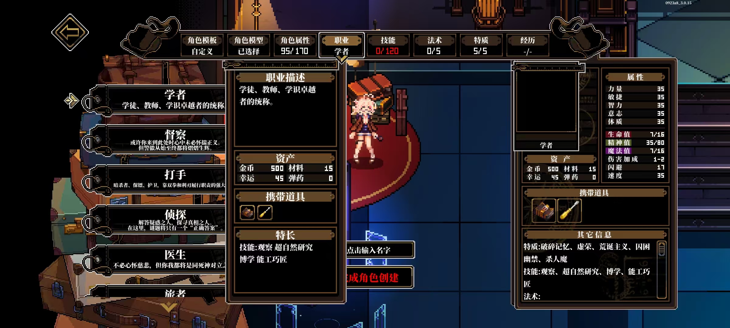 神秘学家以仪式蜡烛(强制绑定不可卸除)、四叶草与魔力符文为专属道具,能力模型围绕超自然研究、灵性感知、微观观察及隐秘行动展开,是解锁深层神话线索与特殊结局的关键职业。九大职业按功能倾向可划分为侦查导向型(如侦探)、知识驱动型(如学者、技术员、神秘学家)、战斗主导型(如打手、督察)及复合支援型(如医生、修士、旅者),每种职业均对应一套差异化五维属性成长曲线,配合独特技能树与道具交互机制,支持玩家构建高度个性化的角色流派。