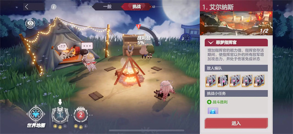 用这个阵型,主C单一前排中心,确保主C能打到中间的怪,其他阵型不太容易打到。后面1-2的思路也一样,就杀这个噩梦指挥官。