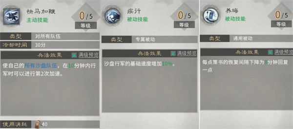 第二行:主动技能【快马加鞭】“二次加速”需额外消耗急速靴,性价比低;【疾行】行军速度加成满级只有10%,效果有限;【养晦】策书恢复速度根据策书上限调整。