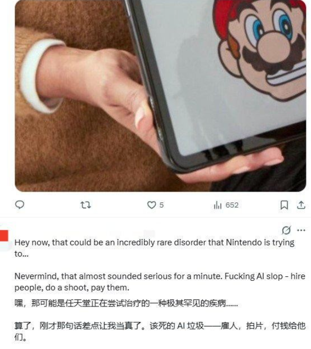 ·不过参演的演员bittoni ·辛格雷亚回应称,当初拍摄时就已经约定不适用AI,事情发酵美国任天堂也迅速回应否认。