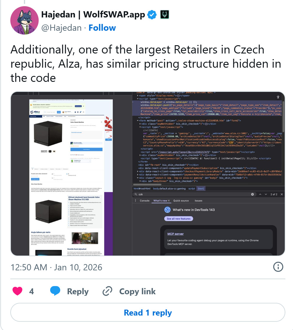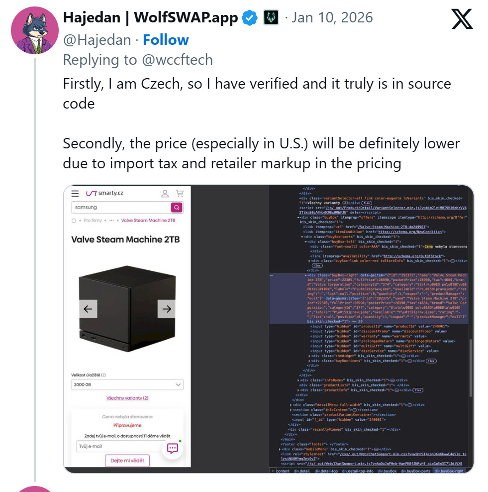 随后,X(原Twitter)平台用户Hajedan进一步调查了捷克大型电商Alza的商品页面(源代码),发现其Steam Machine的定价结构与Smarty.cz高度相似。这一发现进一步提升了泄露信息的可信度。