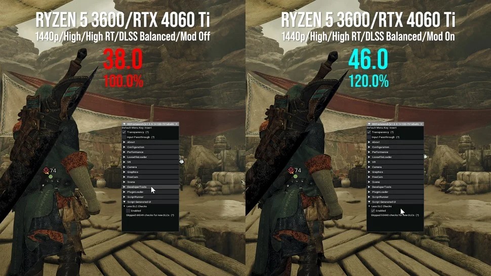 根据分析,显著的帧率下降仅发生在特定的枢纽区域,且只有当玩家靠近“随从猫支援柜台”时才会触发。此NPC的功能是持续检查玩家拥有的DLC内容,正是这一后台进程成为了性能瓶颈。Digital Foundry测试了玩家自制的“减少DLC检查”模组,发现在使用Ryzen 5 3600处理器的测试平台上,性能确实得到了提升。
