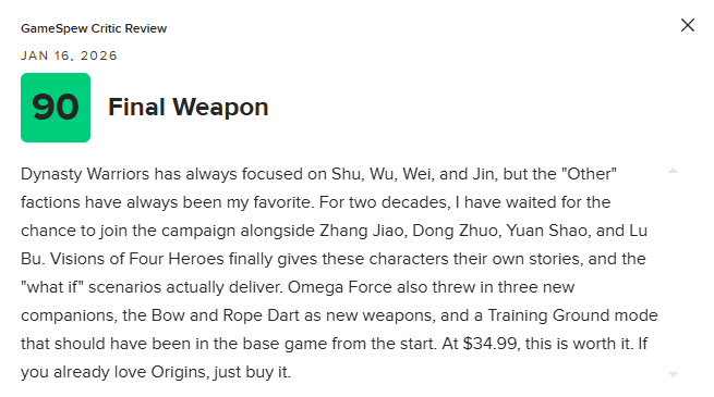 《真三国无双:起源》DLC“梦幻四英杰”M站82分:物有所值!