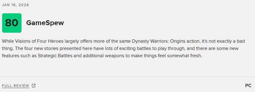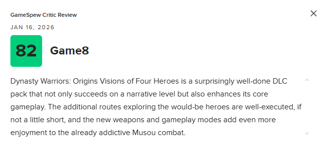 《真三国无双:起源》的大型DLC“梦幻四英杰”将于1月22日正式发售。近日,该DLC的媒体评分也已解禁。截至目前,“梦幻四英杰”M站媒体均分为82分,共收录7家媒体。