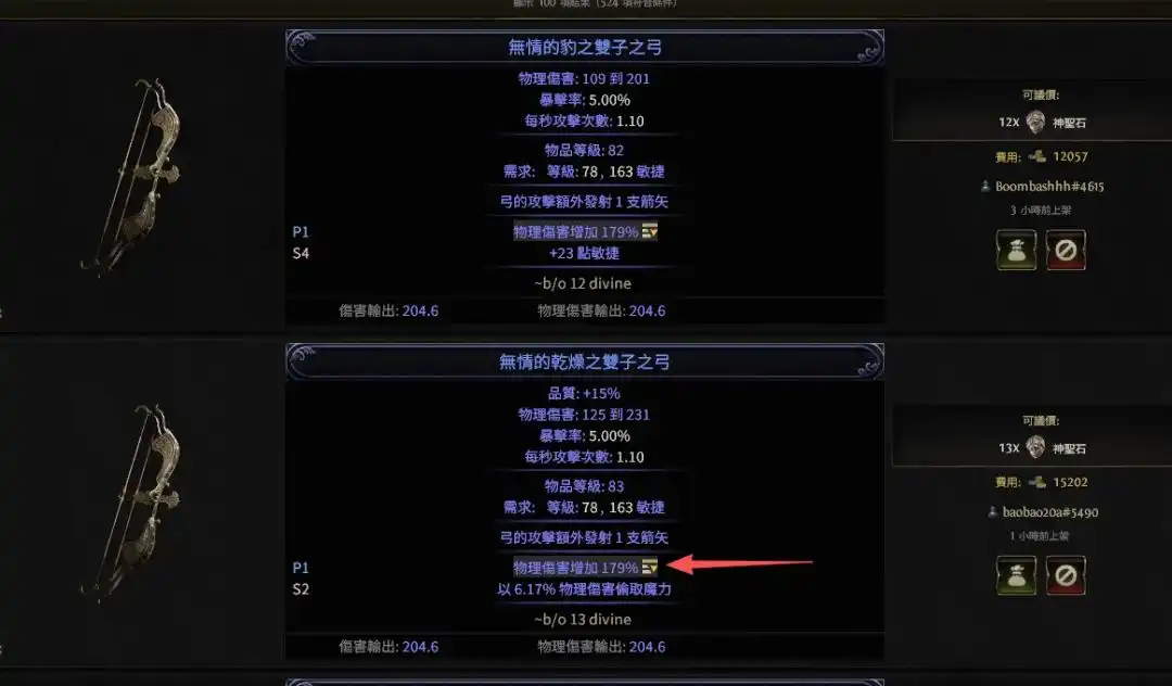 比如82物品等级的白色双弦弓,用完美蜕变石和完美增幅石点出物理大伤词条之后,就可以直接卖几d到十几d了。