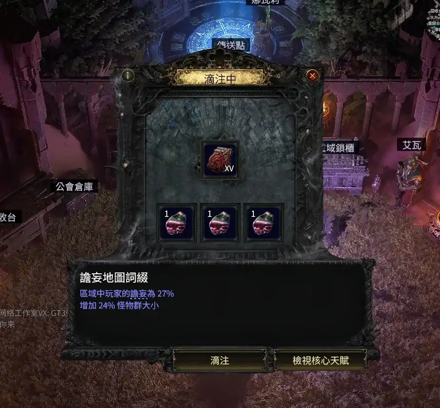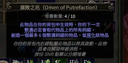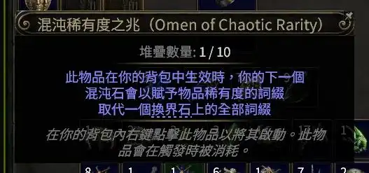 还可以给地图涂油,一般选择加怪物数量和稀有度的涂油,记得用腐化之兆前,要先涂油,因为腐化之后的地图就不能涂油了。