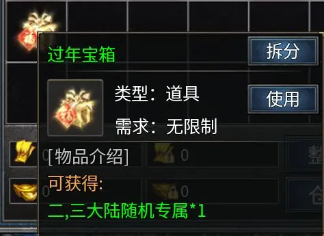 产出:过年宝箱(随机二/三大陆专属装备)、真充红包