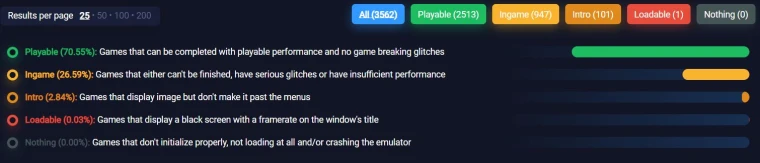 用户可通过其官方网站的兼容性页面,查询具体游戏的运行状况。目前,除可完美运行的游戏外,约有26.59%的游戏属于“可进入”但无法通关的状态,通常源于性能问题或错误。另有不到3%的游戏仅能启动至标题画面,而完全无法启动的游戏占比已低于0.1%。