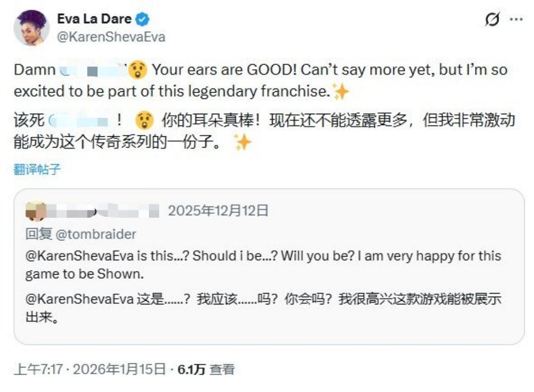 这一消息由伊娃·拉·戴尔本人证实。在2025年12月TGA颁奖典礼上《古墓丽影:催化剂》首支预告片公布后,有粉丝通过声音识别出她的参与。时隔一个多月,拉·戴尔在社交平台上回复该粉丝时写道:“你的耳朵真灵!”她表示自己“还不能透露更多”,但“非常兴奋能成为这个传奇系列的一部分”。