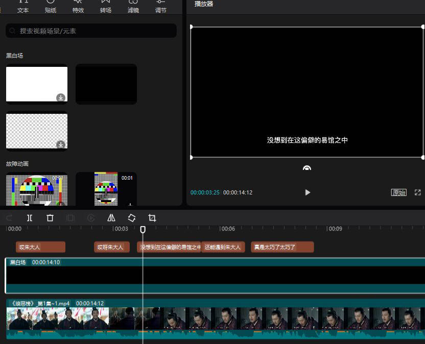 然后在剪映自带的视频库中找到黑场素材并将其添加到视频轴中,将其放在视频画面的上方、字幕的下方位置。也就是说,现在播放器窗口只有黑底白字,如图所示。
