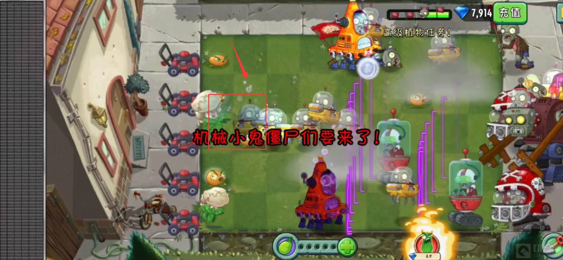 5.来了俩个柚子,种在2.4路,5路的机甲路障让菜花魅惑回去,还能打机械小鬼僵尸。