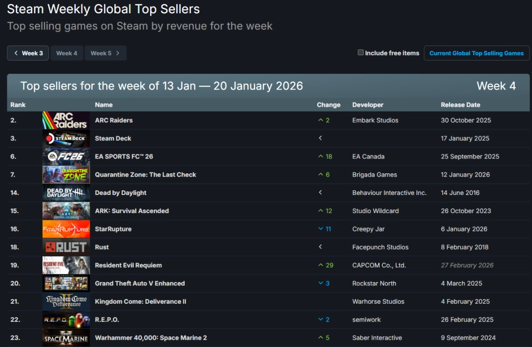 Steam 2025年最新一周游戏销量排行榜出炉(2025年1月13日-2025年1月20日,无免费游戏),本周的冠军依旧是由《ARC Raiders》拿下,该作已持续霸榜超两个月,除此之外,上周获得第三名的《战地6》已经不在榜内,而万众瞩目的《生化危机9:安魂曲》已经开始发力,进入了前十榜单当中,让我们一起来看看具体前十名有哪些大作吧!